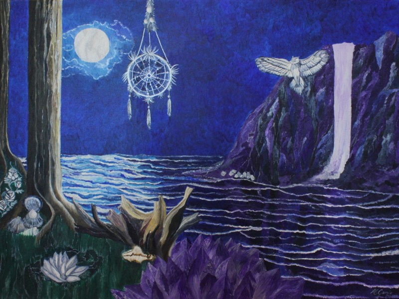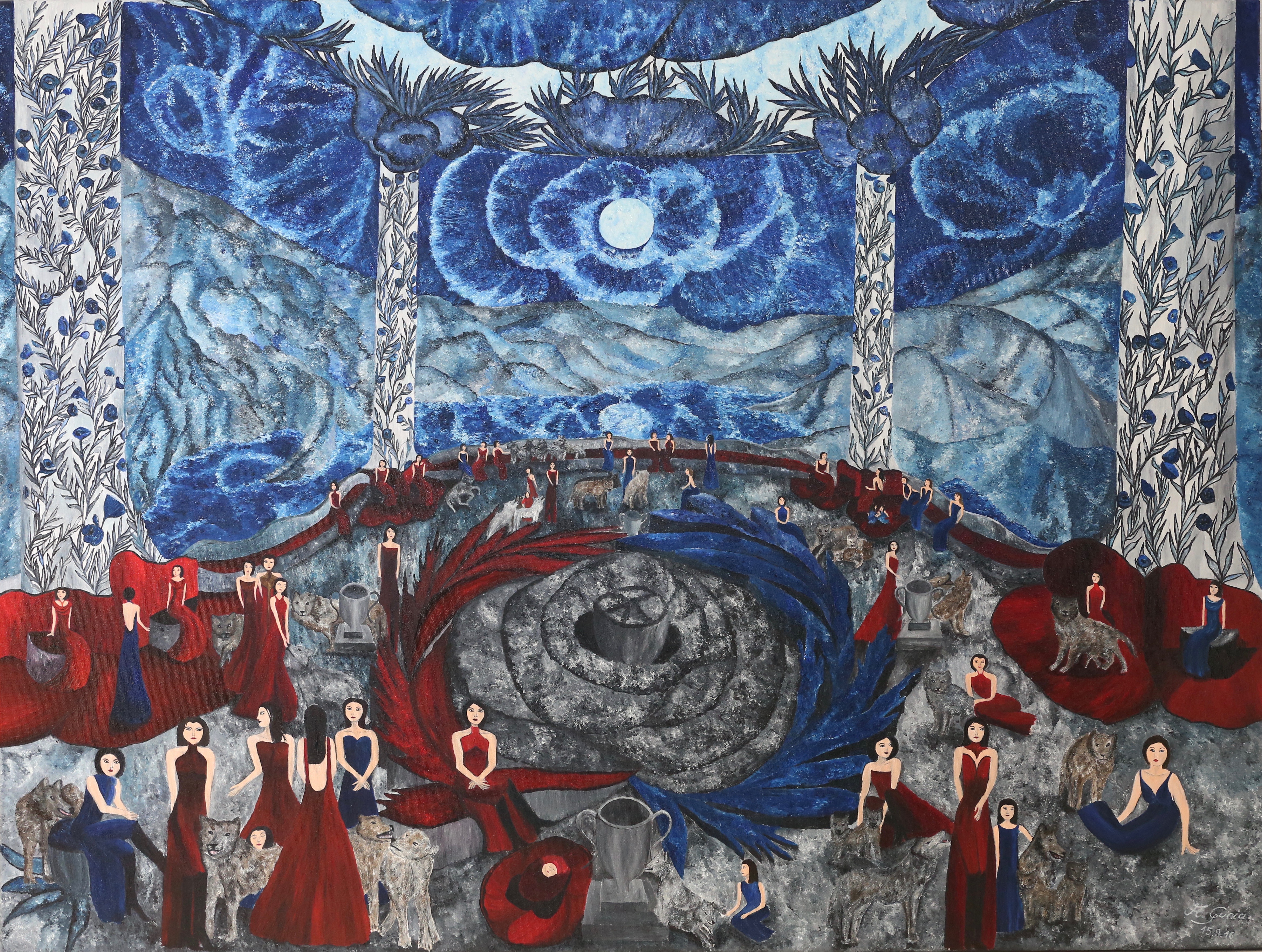 Wie so oft bei meiner Kunst, gibt es bestimmte Werke, die theoretisch zu mehreren Serien gehören können, da die Bereiche fließend ineinander übergehen. In o.g. Serie trifft dies auf die „Mohnmondnacht“ zu. Hauptsächlich gehört es zur Serie: Die Stunden des Mondes, da auch der Mond mit seiner Symbolik ein wunderschönes Motiv an sich ist. Dennoch gehört der Wolf ebenfalls zu den gefährdeten Tierarten, was dieses Bild wieder einmal ein wenig zwischen die Serien setzt. Allgemein stehen die Stunden des Mondes für die Schönheit und Mystik der Nacht.